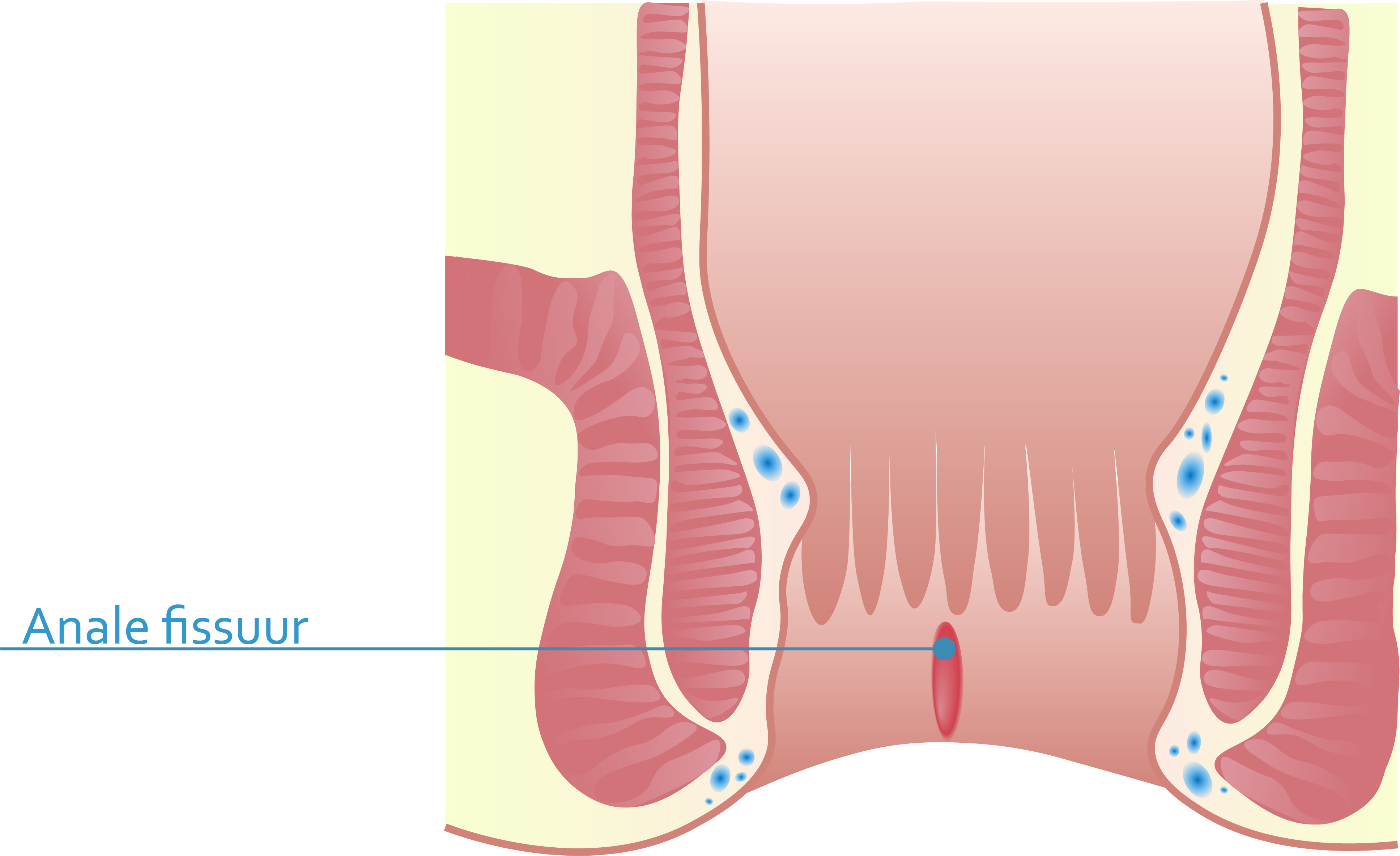 Een anale fissuur is een kloofje of scheurtje in het anaal kanaal, meestal in de lengterichting van de bilspleet en aan de voor- of achterzijde van de anus. Zo’n wondje is vaak heel pijnlijk en gaat gepaard met een branderig gevoel tijdens en na het maken van stoelgang, soms kan er ook wat bloed- of slijmverlies aanwezig zijn.